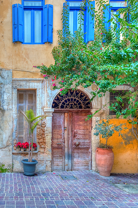 Vibrant Mediterranean colours adorn the picturesque and charming cafes and restaurants of Crete.