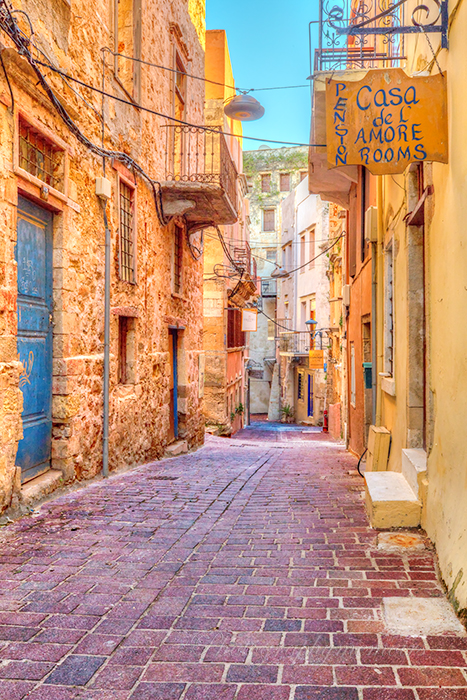 Sunrise over the picturesque bay of Chania highlights the beautiful Venetian facades of a bygone era