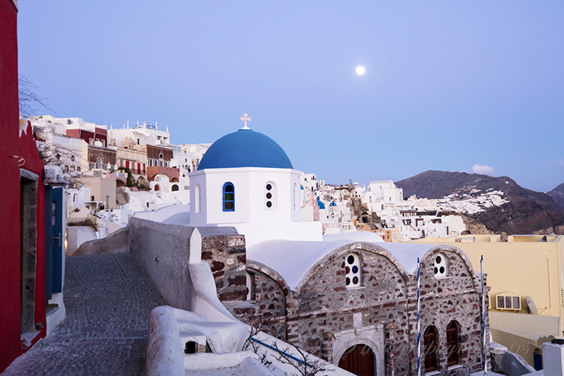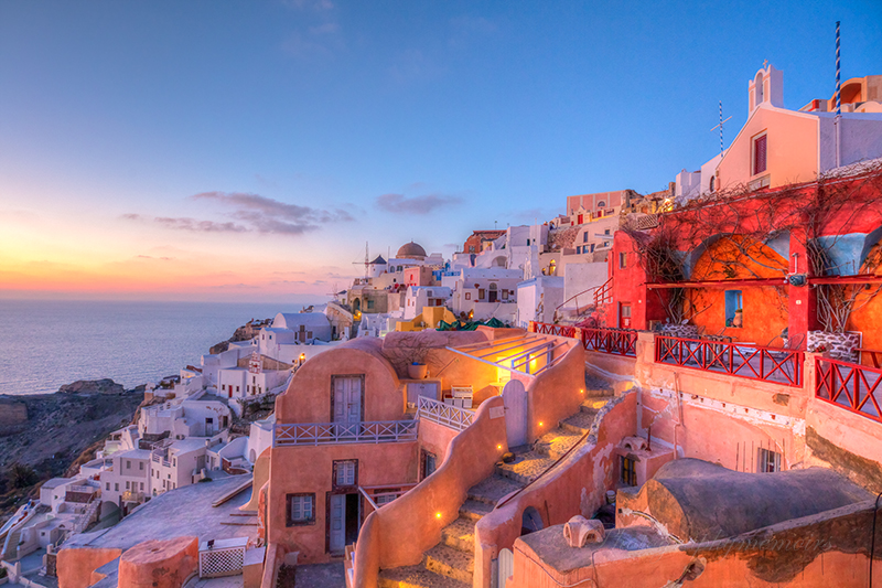 White washed building with vibrant colours and blue domed churches, reflect the beauty of Santorini.